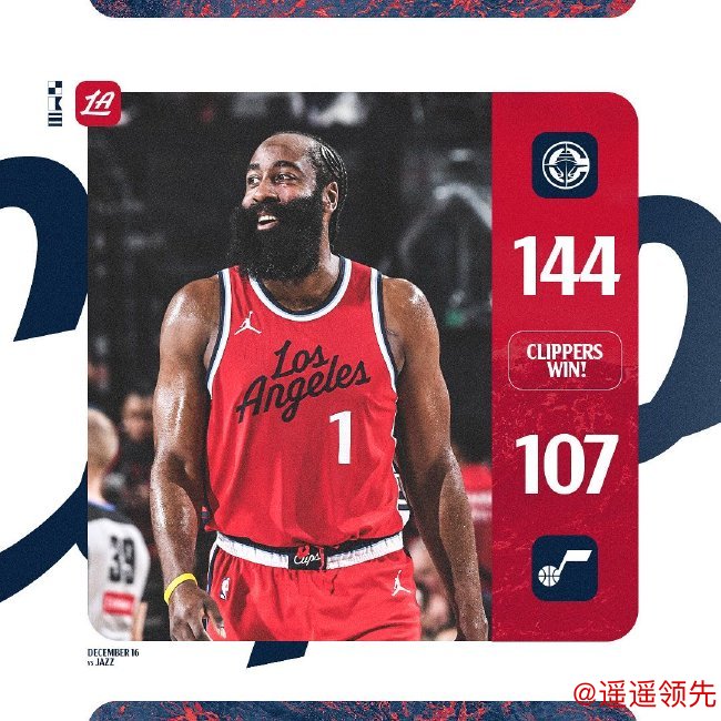 快船(15-12):哈登41分6助攻、鲍威尔29分4篮板、祖巴茨19分12篮板、科菲16分3篮板3助攻、邓恩12分4助攻